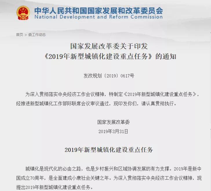 4月8日上午,国家发改委官网上挂出了一个重要通知。在这份名为《2019年新型城镇化建设重点任务》(通知原文地址点击文章底部)的重要通知中,释放出了一系列重大信号: